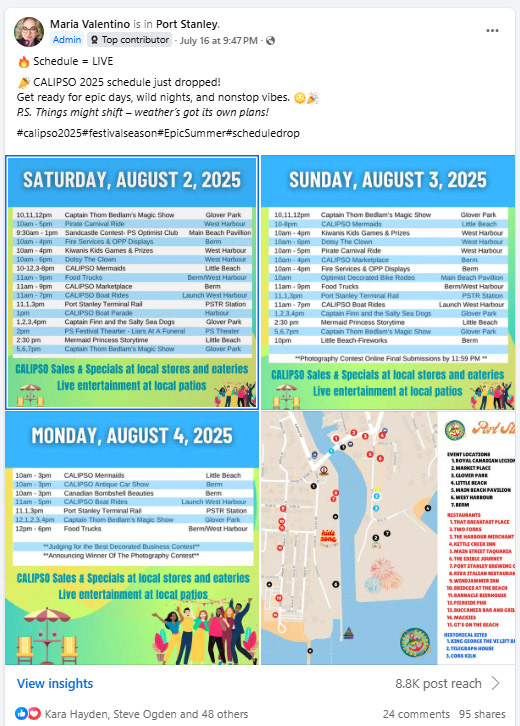 I am delighted to share that I played a crucial role in organizing the successful CALIPSO Summer Festival in Port Stanley in 2023, which received a great response from the public. Here are some of my contributions to the festival. I am excited to continue participating in this multi-day event in 2024.Â